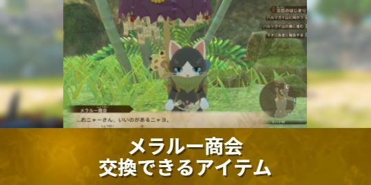 メラルー商会は、珍しいアイテムを交換できる特別なお店です。交換には、お金でなく、ビンの王冠が必要になります。ビンの王冠は古代巣やサブクエストの報酬などで入手できます。ストーリーの進行してくと交換できるアイテムが増えていきます